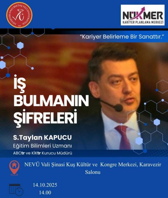 Üniversitemiz Kariyer Planlama Uygulama ve Araştırma Merkezi (NÜKMER) ile Turizm Fakültesi iş birliğinde, öğrencilerimizin kariyer gelişim süreçlerine katkı sağlamak ve istihdam edilebilirlik becerilerini artırmak amacıyla “İş Bulmanın Şifreleri” konulu bir eğitim programı düzenlenecektir. Söz konusu eğitim, Eğitim Bilimleri Uzmanı Sayın S. Taylan Kapucu tarafından gerçekleştirilecektir. Program kapsamında katılımcıların iş arama stratejileri, mülakat teknikleri ve kişisel markalaşma süreçlerine ilişkin bilgi ve farkındalıklarının geliştirilmesi hedeflenmektedir.