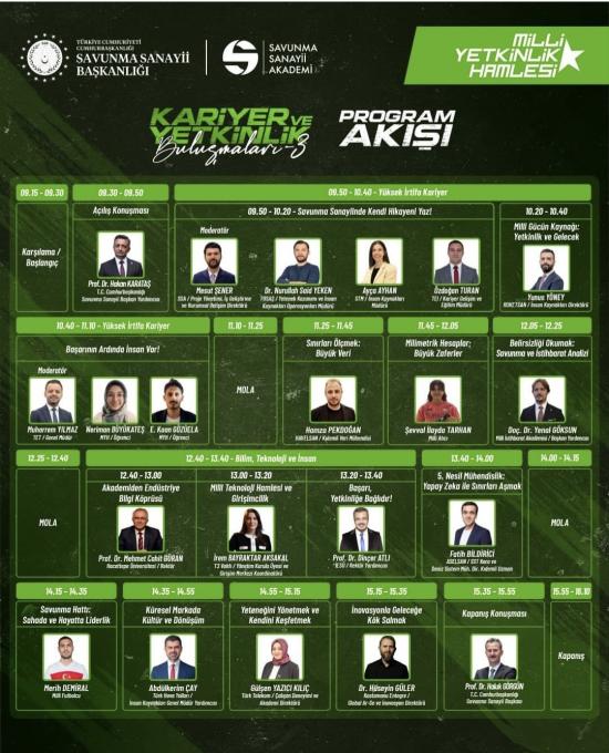 Alanında uzman konuşmacıların katılımıyla düzenlenecek programda; kariyer odaklı oturumlar, ilham veren konuşmalar ve erken dönem kariyer fırsatlarına ilişkin bilgilendirmeler yer alacaktır. Etkinlik, öğrencilerin kariyer farkındalıklarını artırmayı ve savunma sanayii başta olmak üzere farklı sektörlerde ihtiyaç duyulan yetkinlikler hakkında bilgi edinmelerini amaçlamaktadır.