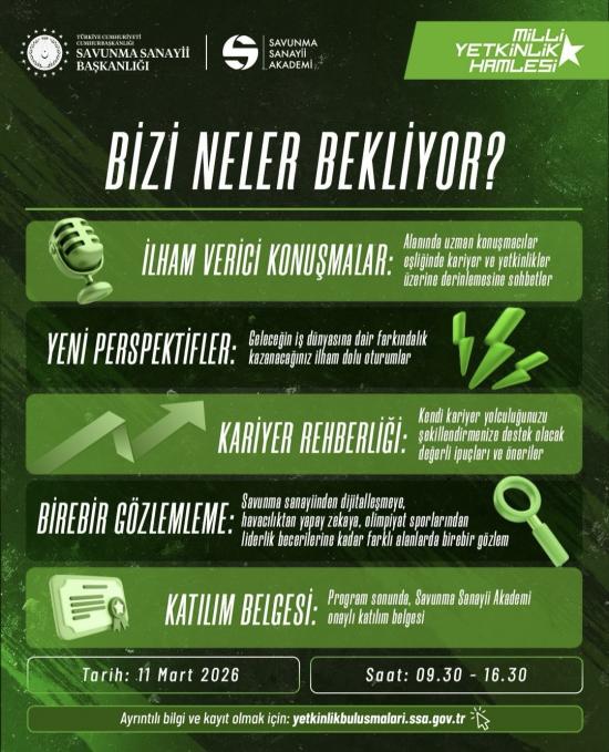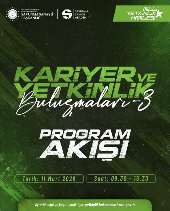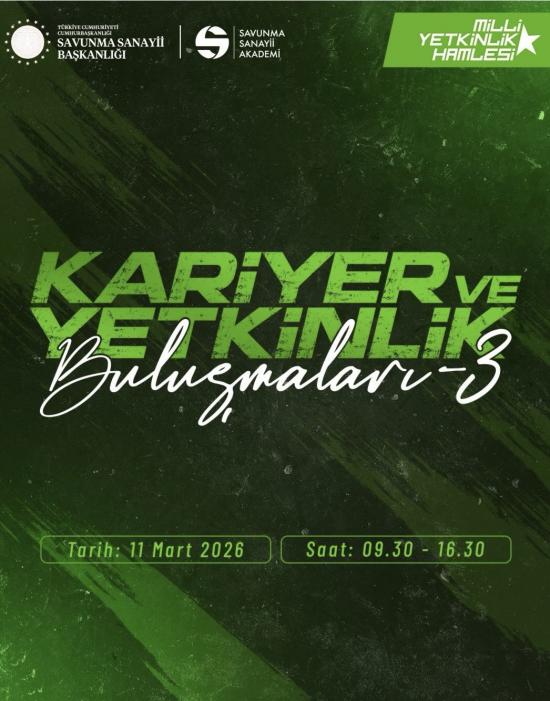 Savunma Sanayii Başkanlığı tarafından yürütülen “Millî Yetkinlik Hamlesi” kapsamında düzenlenen Kariyer ve Yetkinlik Buluşmaları etkinliğinin üçüncüsü, 11 Mart 2026 Çarşamba günü 09.30–16.00 saatleri arasında çevrim içi olarak gerçekleştirilecektir.